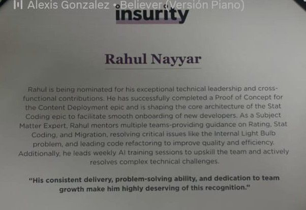 राहुल नैय्यर को उनके शानदार तकनीकी नेतृत्व और टीम के प्रति समर्पण के लिए सराहा गया है। उन्होंने सफलतापूर्वक कंटेंट डिप्लॉयमेंट एपिक का प्रूफ ऑफ कॉन्सेप्ट पूरा किया और नए डेवलपर्स को आसानी से काम सिखाने के लिए स्टेट कोडिंग एपिक के मूल आर्किटेक्चर को आकार दिया।