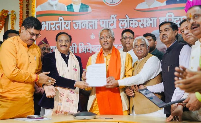 हरिद्वार। भारतीय जनता पार्टी के हरिद्वार सीट से उम्मीदवार पूर्व मुख्यमंत्री त्रिवेंद्र सिंह रावत ने आज अपना नामांकन जमा कर दिया। भाजपा के जिला कार्यालय पर सैकड़ों पार्टी कार्यकर्ताओं के बीच उन्होंने अपना नामांकन ऑनलाईन भरा। नामांकन करने के बाद दिल्ली भाजपा हाईकमान द्वारा उन्हें भेजा गया पार्टी का सिंबल पूर्व सांसद डॉ निशंक ने सौंपा। इस दौरान पूर्व सांसद डॉ निशंक, मदन कौशिक, पार्टी विधायक आदेश चौहान, प्रदीप बत्रा, पूर्व विधायक यतीश्वरानंद, पूर्व विधायक संजय गुप्ता, पूर्व विधायक देशराज कर्णवाल आदि कई वरिष्ठ कार्यकर्ता एवं पदाधिकारी मौजूद रहे।
