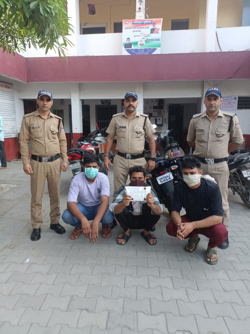 हरिद्वार। सट्टे की खाईबाड़ी की सूचना पर कार्रवाई करते हुए ज्वालापुर कोतवाली पुलिस ने मौहल्ला कैथवाड़ा में छापामारी कर तीन सटोरियों को दबोच लिया। गिरफ्तार किए गए आरोपियों हिमांशु पुत्र प्रमोद कुमार निवासी मोहल्ला कड़च्छ,देवांग पुत्र महेन्द्र निवासी त्रिमूर्ति नगर सुभाष नगर व अरुण पुत्र मेषपाल निवासी सलेमपुर के कब्जे से पुलिस टीम ने सट्टा सामग्री(पर्ची,पैन,डायरी व 6470रूपए की नकदी बरामद की है। आरोपियों के खिलाफ जुआ अधिनियम के तहत मुकद्मा दर्ज किया गया है। पुलिस टीम में एसआई विकास रावत, कांस्टेबल दीपक चौहान, अंकित कवि, अजय पवार व रणवीर सिंह शामिल रहे।
