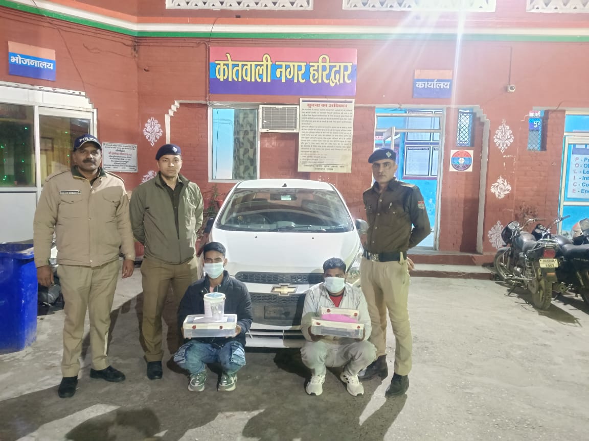 हरिद्वार। नगर कोतवाली पुलिस ने शातिर चोरों को गिरफ्तार किया है। आरोपियों के कब्जे से 315 बोर व 12बोर के दो तमंचे,2जिंदा कारतूस,दिल्ली से चोरी की गयी बिना नंबर की कार व मेरठ से चोरी किए गए चांदी के सिक्के,मूर्ति व जेवर आदि बरामद हुए हैं। निकाय चुनाव के मद्देनजर चलाए जा रहे चेकिंग अभियान के दौरान भीमगोड़ा बैरियर पर पुलिस ने बिना नंबर की एक शेवरले कार को रूकने को इशारा किया तो चालक तेजी से गाड़ी लेकर भागने लगा। पुलिस ने पीछा कर काली मंदिर के पास कार को रोक लिया। कार की तलाशी पर लेने पर उसमें कंगन,चांदी की मूर्ति,कटोरी,सिक्के,जोत आदि बरामद हुए।दोनों की तलाशी लेने पर उनके कब्जे से तमंचे व कारतूस बरामद हुए। पूछताछ करने पर आरोपियों ने अपने नाम मंझर पुत्र अव्वास व राहुल पुत्र हरिचंद निवासी गांव कोटला मयूर विहार फेस 1 थाना मयूर विहार नई दिल्ली बताए। आरोपियों ने बताया कि कार से दिल्ली से व मूर्ति व सिक्के आदि अन्य समान मेरठ से चोरी किया है। पुलिस टीम में एसएसआई विरेन्द्र चन्द रमोला,एसआई प्रदीप कुमार,हेडकांस्टेबल संजयपाल,राजेश रावत व कांस्टेबल विनीत नौटियाल शामिल रहे।